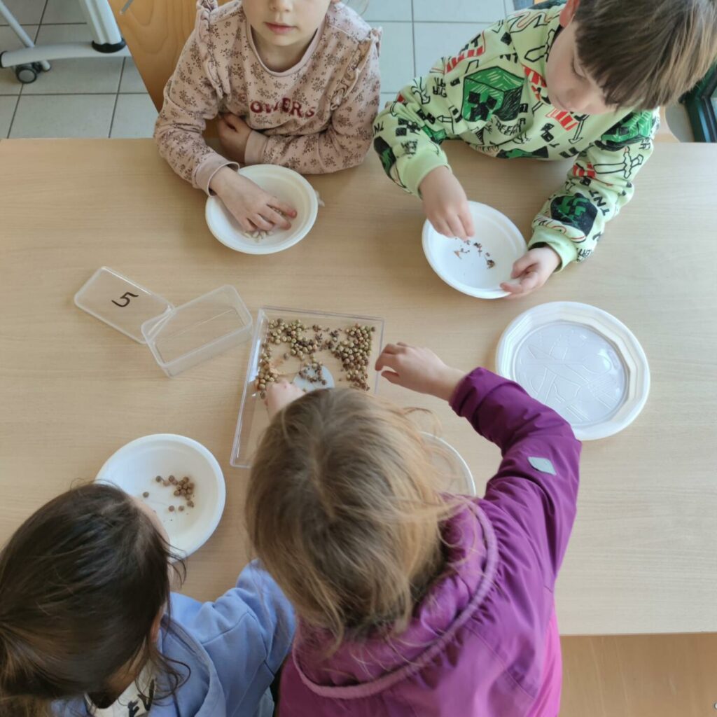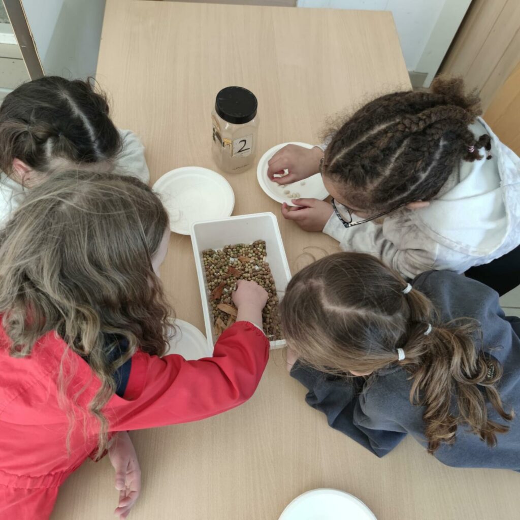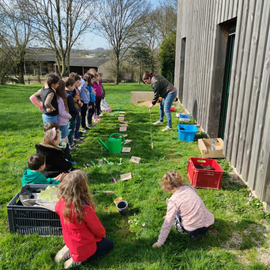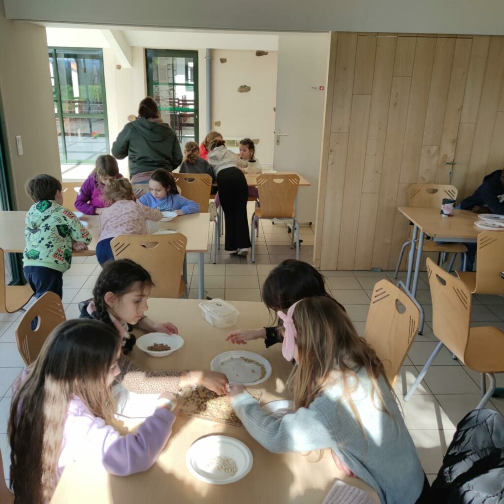 Après un bon déjeuner (betteraves, escalope de dinde, brocolis, île flottante) où tout le monde a bien mangé, atelier jardin du bonheur avec étude des outils de jardinage, tri de graines, semis de graines et bouturage.