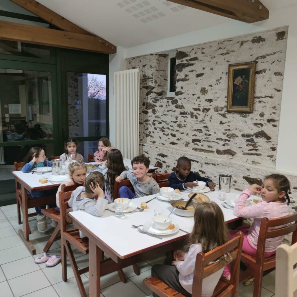 Pour le dîner, potage de légumes, gratin de poisson, pommes de terre, yaourt. Le potage a reçu un succès mitigé et le poisson peu de succès ! Tout le monde était bien fatigué après cet après-midi au grand air.