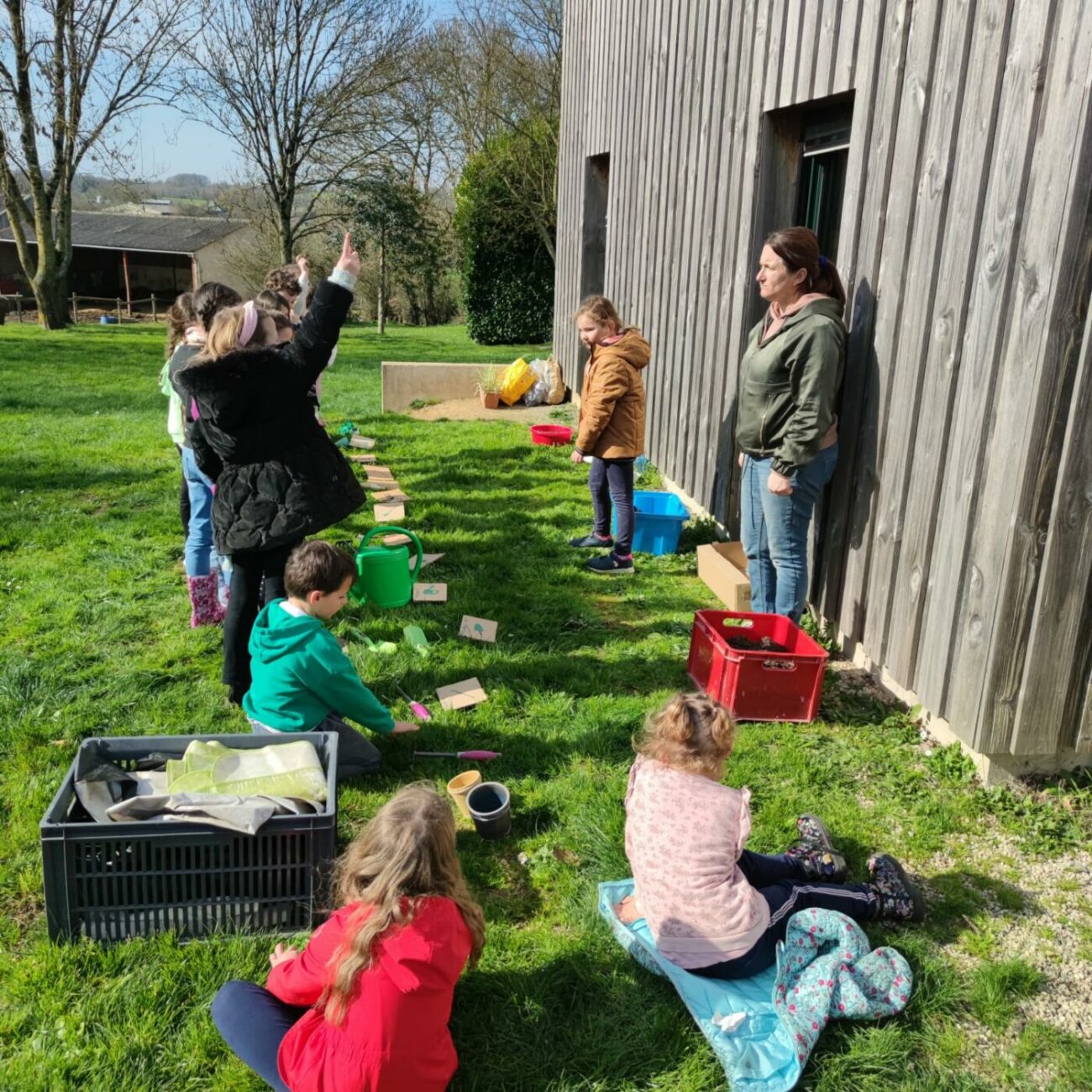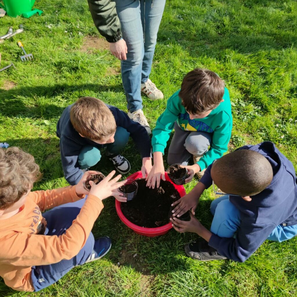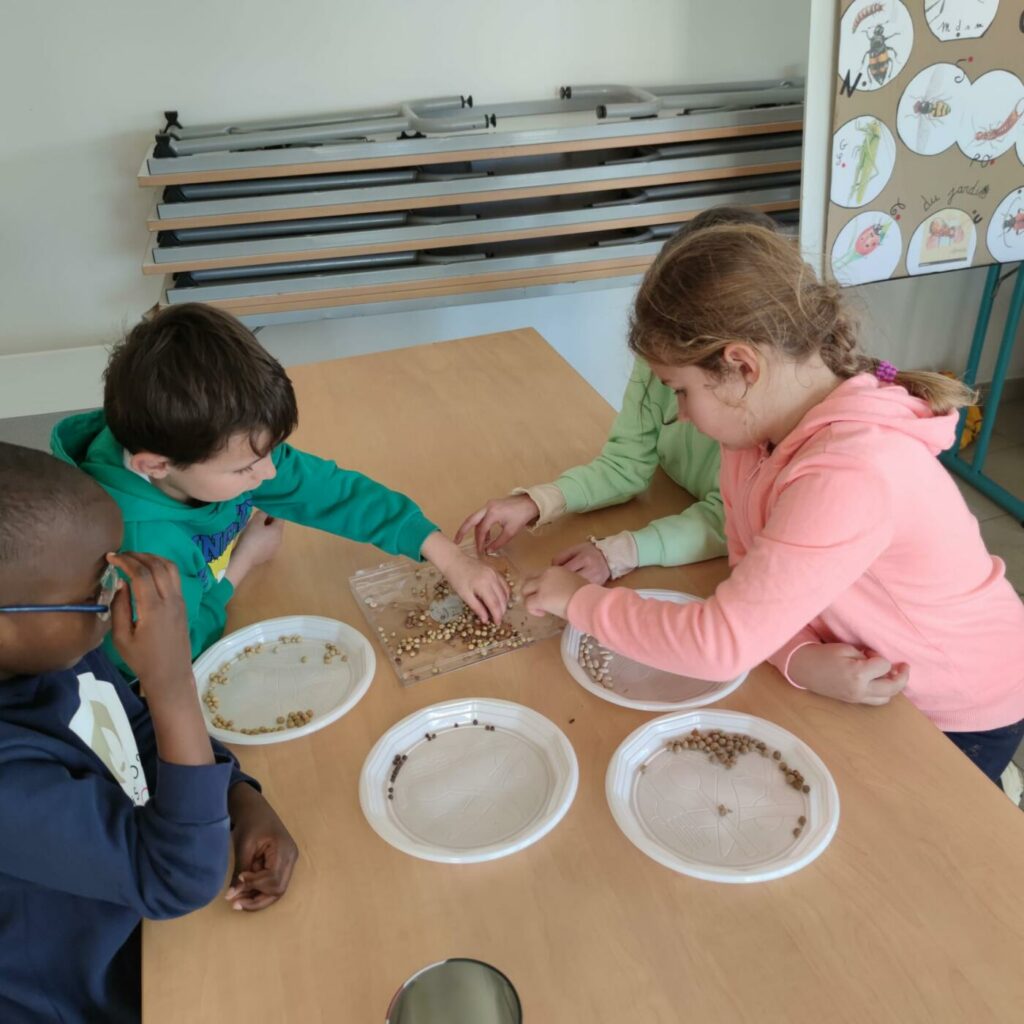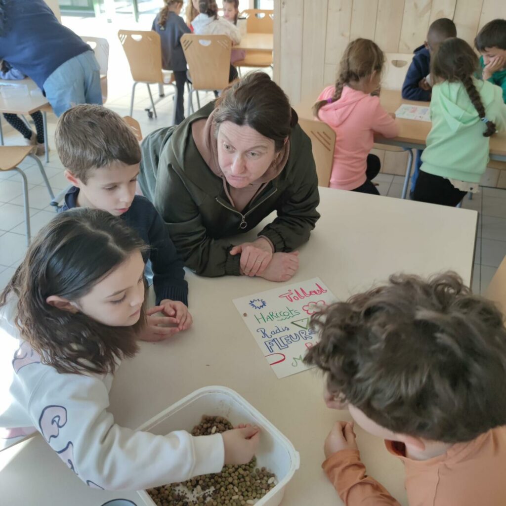 Après un bon déjeuner (betteraves, escalope de dinde, brocolis, île flottante) où tout le monde a bien mangé, atelier jardin du bonheur avec étude des outils de jardinage, tri de graines, semis de graines et bouturage.