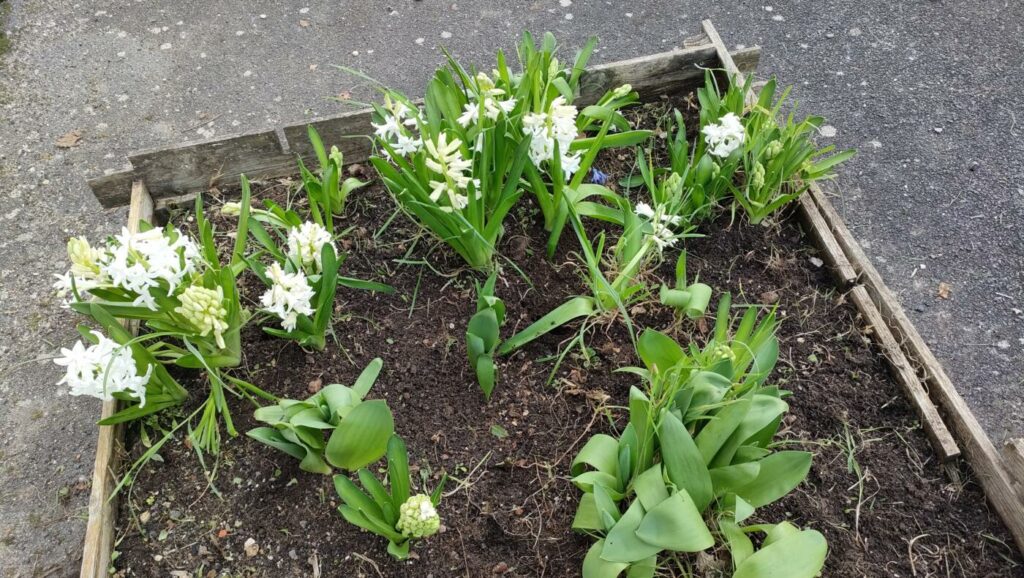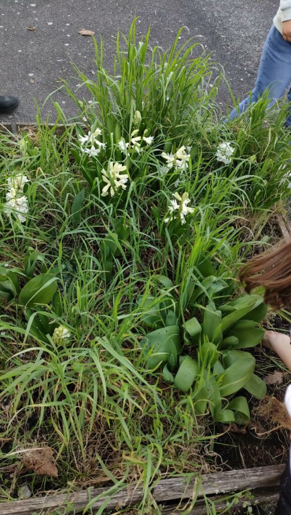 Les élèves de la classe de GS, ont pu désherber les jardinières et le carré de jardin qui sont devant leur classe: le soleil est revenu, enfin! On peut maintenant profiter des belles jacinthes blanches et des jonquilles qui étaient parmi les grandes herbes.