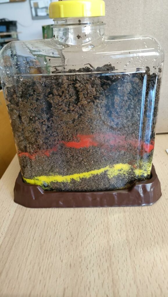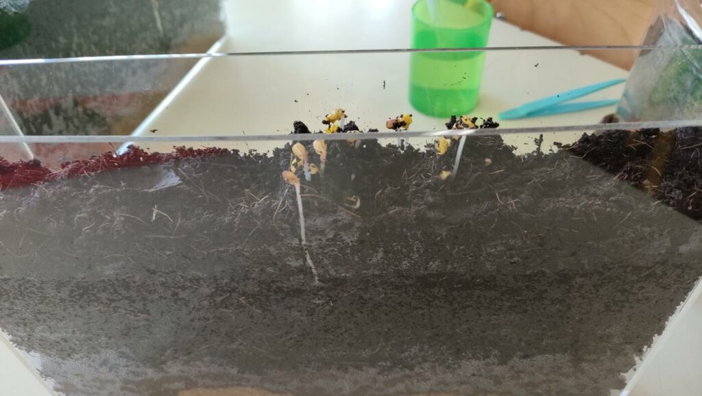 Dans le visio-lombrics, ils ont installé 5 vers de terre. Et depuis le début de la semaine dernière, les élèves observent: des plantes poussent déjà! Et les vers de terre se déplacent dans leur nouvel habitat.