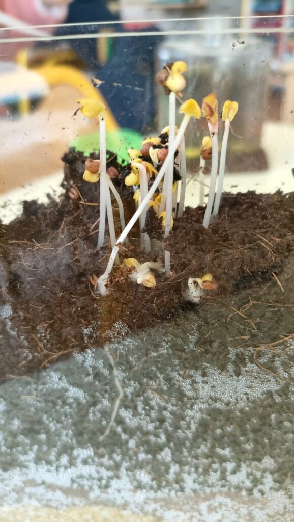 Et dans la classe, les enfants ont réalisé les deux visio-racines que le Père-Noël avait apportés, ainsi que le visio-lombrics. Dans les visio-racines, ils ont semé des graines de haricots, de carottes, de radis et même une cacahuète !